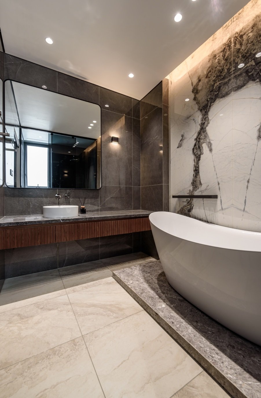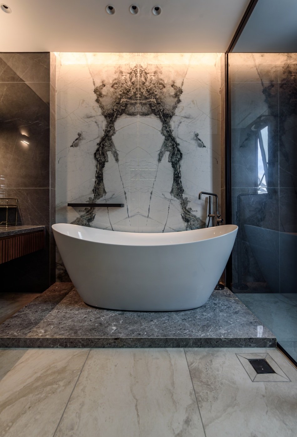 Mystic – an Italian marble-look tile featuring characteristic sedimentary veining – serves as the primary tiling choice for the interior, delivering an impressive and prestigious aesthetic.