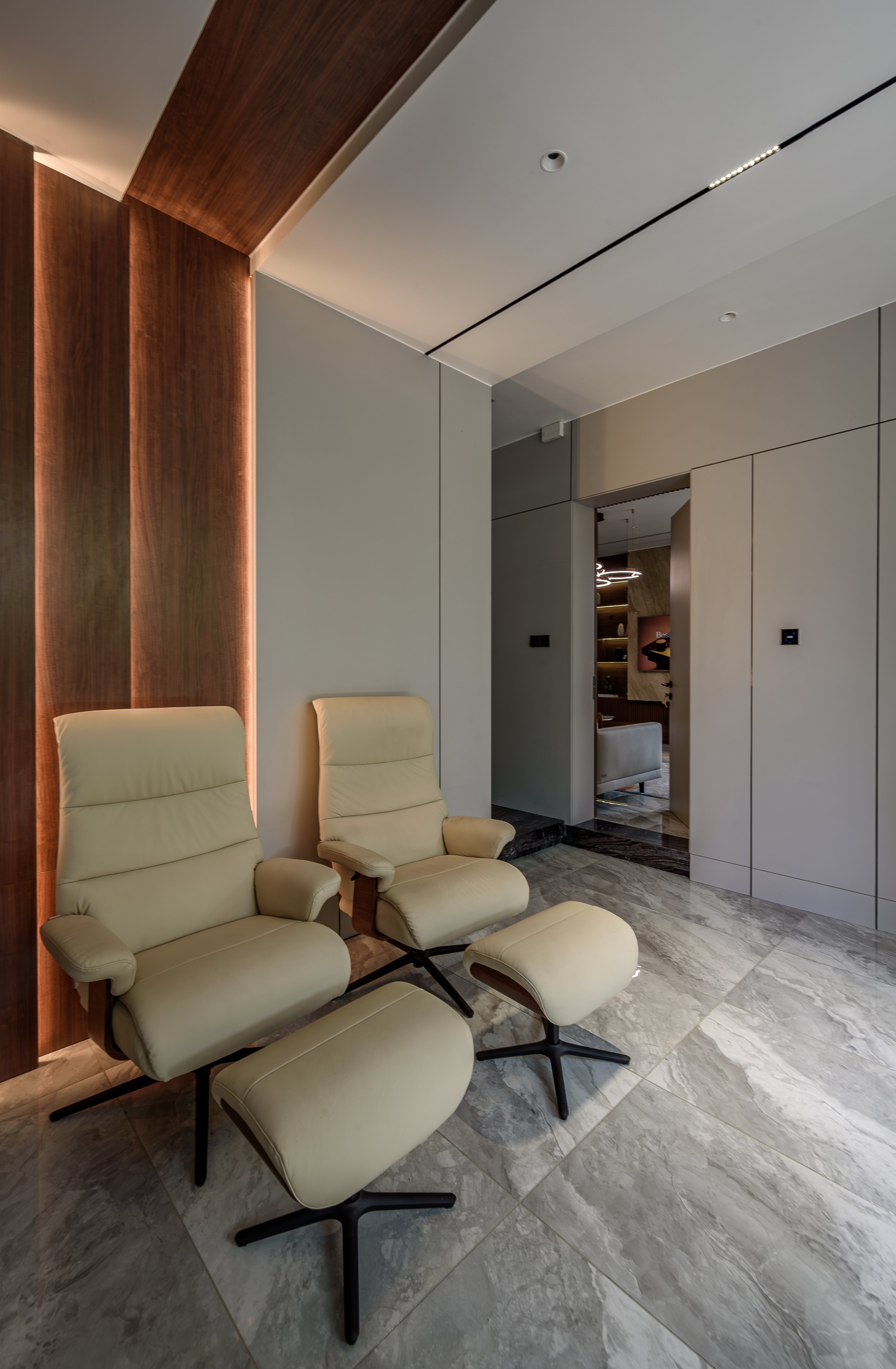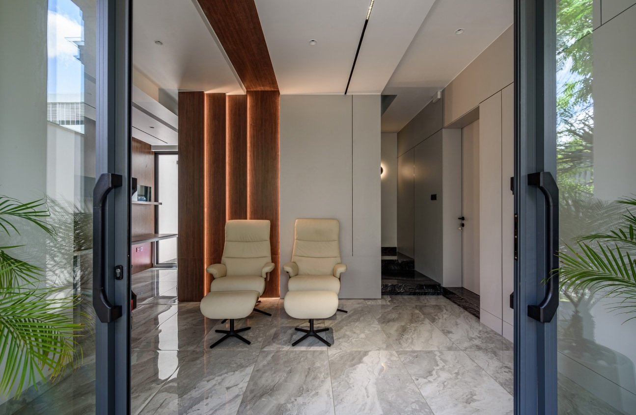 The facade is clad in the Travertino collection, while M Stone tiles featuring antibacterial technology are utilized in outdoor areas, ensuring a safe living environment for the family.