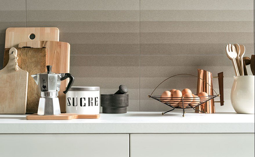 Sự chuyển dịch của các gam màu từ không gian sàn đến tường nhà bếp đem đến một không khí rộng mở cho không gian này.