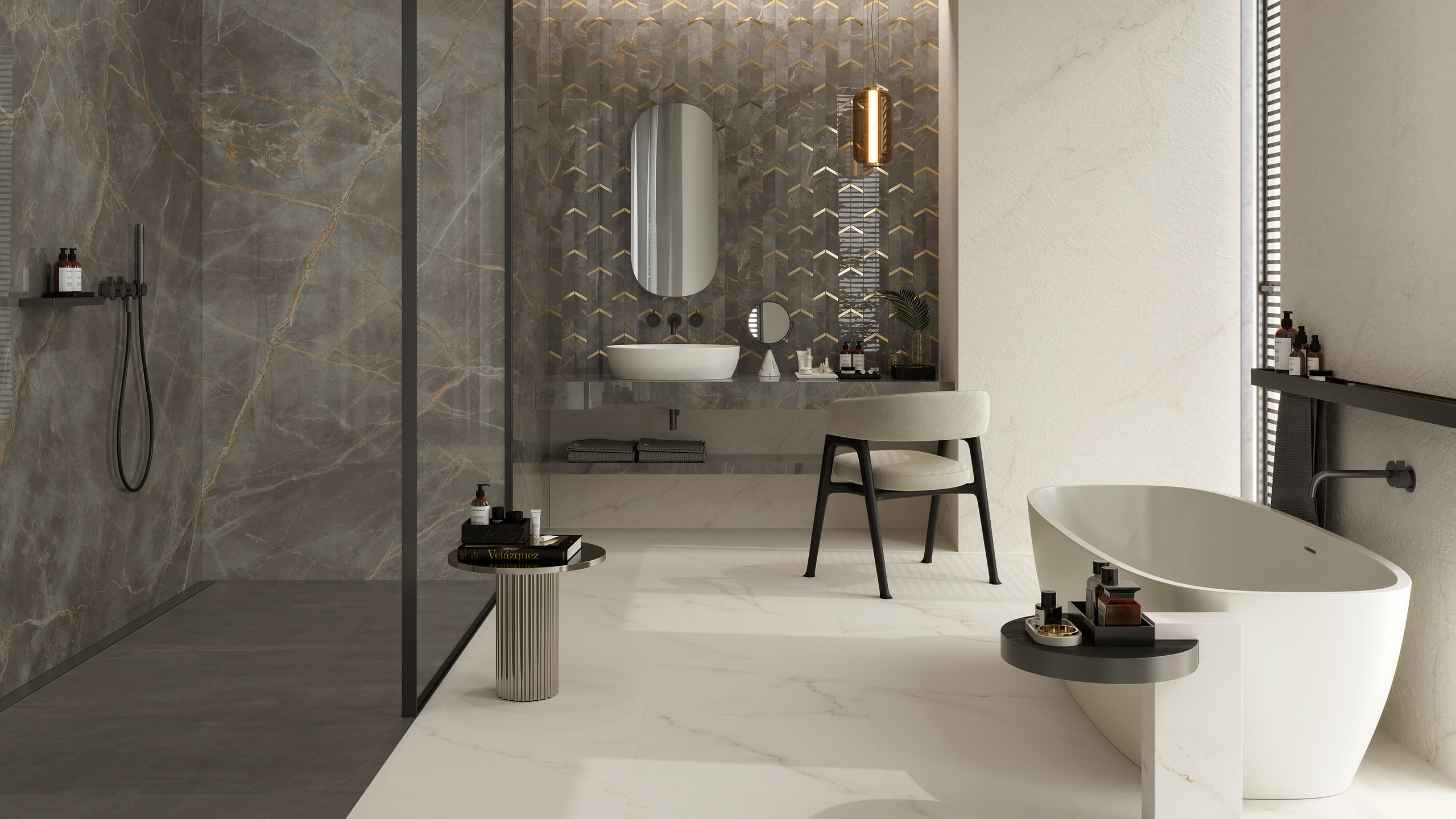 Calacatta là một loại marble quốc bảo của nước Ý đến từ đỉnh Apuan Alps, vật liệu chính tạo nên tượng David của Michelangelo và nhiều công trình nghệ thuật di sản khác. Thiết kế Calacatta Apuano của bộ sưu tập Marvel X tái hiện sắc trắng với vân vàng của marble Calacatta, với ba lựa chọn bề mặt: bóng (polished), mờ mịn (silk) và sần (hammered) tạo nên không gian hiện đại ấn tượng.