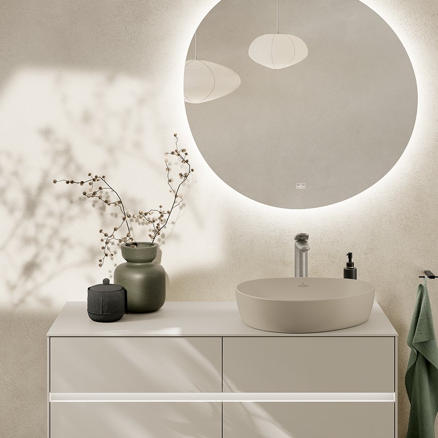 Chậu rửa đặt bàn Villeroy & Boch Antao mang thiết kế lấy cảm hứng từ giọt sương trên lá, nổi bật với đường cong mềm mại và hình dáng độc đáo. Sản phẩm được chế tác từ vật liệu TitanCeram siêu bền, có bề mặt mờ và tông màu Almond (Hạnh nhân), đi kèm lớp men chống bám bẩn CeramicPlus và công nghệ men TitanGlaze. Chậu không có lỗ xả tràn và không có lỗ gắn vòi, là lựa chọn tinh tế cho phòng tắm hiện đại.