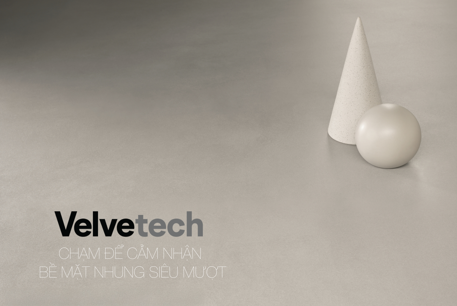 Công nghệ bề mặt Velvetech mô phỏng hiệu ứng hạt cát với các khía siêu nhỏ ẩn trên bề mặt, tạo nên lớp ánh nhẹ và chiều sâu ấn tượng cho gạch, đồng thời tăng cường độ mịn mượt để đem đến trải nghiệm dễ chịu cho mọi sinh hoạt.