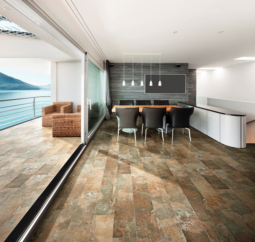 Thiết kế gạch vân đá màu sắc mạnh như vân đá đỏ bazan kết nối không gian trong nhà và ngoài trời để nhấn mạnh cá tính của gia chủ trong các buổi tiệc cuối tuần sang trọng và “chất “ hơn.