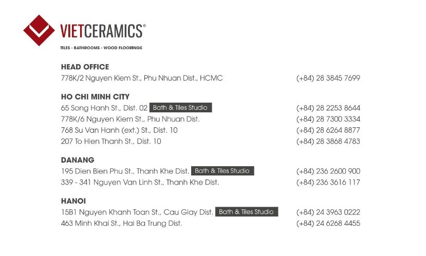 Để được tư vấn về chi tiết, vui lòng ghé thăm các showroom trên toàn quốc hoặc liên hệ hotline: 0797555299, truy cập vào website www.vietceramics.com.vn, fanpage Vietceramics https://www.facebook.com/Vietceramics/ để biết thêm chi tiết.
