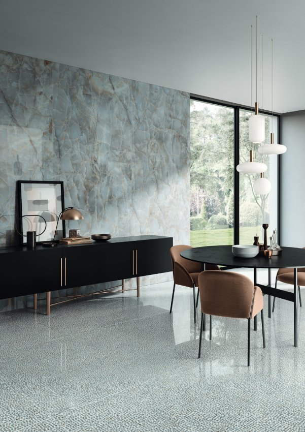 Mang cảm hứng từ họa tiết hoa lá Tây "Acanthus" - biểu tượng của phong cách châu Âu cổ điển không thể thiếu trong những công trình kiến trúc đồ sộ, gạch khổ lớn Tele di Marmo Revolution khẳng định vẻ đẳng cấp của đá cẩm thạch trong các thiết kế tinh tế, ấn tượng. Trong khi đó, Cosmopolitan với thiết kế màu xanh đặc trưng, cảm hứng của đá Amazonite huyền bí mang tới cảm giác thư thái, sự cân bằng trong cảm xúc cho bất cứ không gian sống nào.