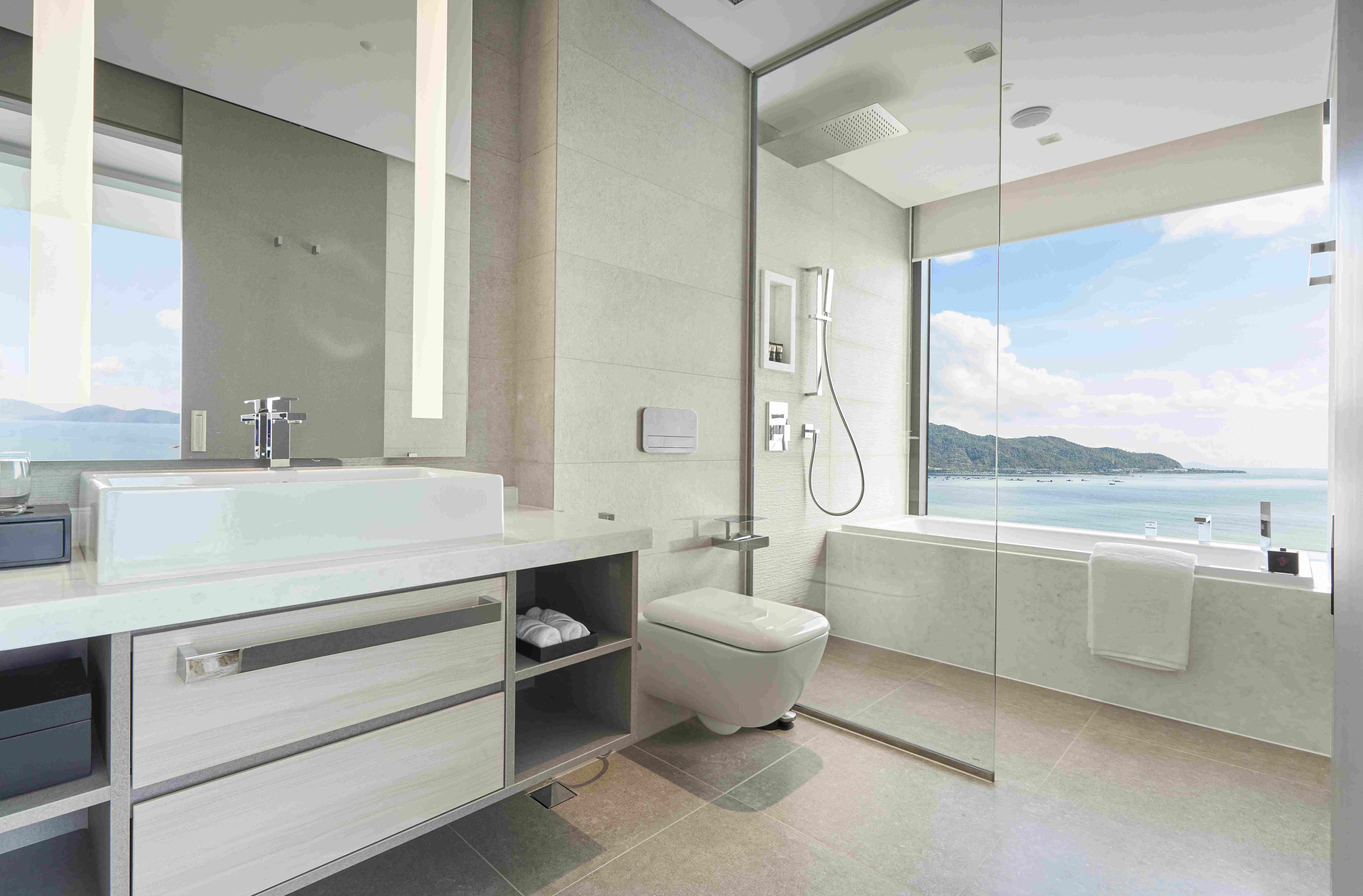 Trong đó, phòng tắm được ốp gạch vân đá tự nhiên với tông màu xám trắng chủ đạo cùng các thiết bị phòng tắm thuộc các bộ sưu tập Gessi Eleganza, Rettangolo, Goccia, từ vòi nước, chậu rửa mặt, bồn cầu đến hệ thống sen tắm Gessi Private Wellness, giúp tái tạo lại nguồn năng lượng. Từ không gian phòng tắm, du khách có thể thu trọn khung cảnh đường bờ biển phía dưới, tận hưởng kỳ nghỉ dưỡng thanh bình và hòa hợp với thiên nhiên.