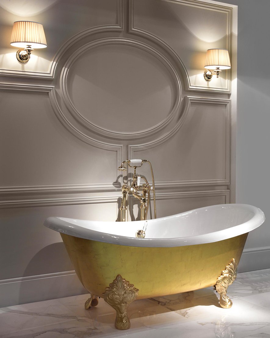 Các đường nét nội thất mang màu sắc mạ vàng cũng đóng vai trò lớn trong việc định hình không gian thiết kế Ý và xuất hiện ở khắp mọi nơi - khung gương, họa tiết bồn tắm hay trên các thiết kế gạch ốp lát. Kiệt tác bồn tắm Mida với chất liệu gang đúc, bề mặt vàng lá 24 carat và chân bồn tắm Flora họa tiết lá tinh tế được chế tác với phong cách thủ công kết hợp cùng giá trị truyền thống Florence như thu hút mọi ánh nhìn, góp phần mang vẻ đẹp cổ điển đến một cung bậc mới.