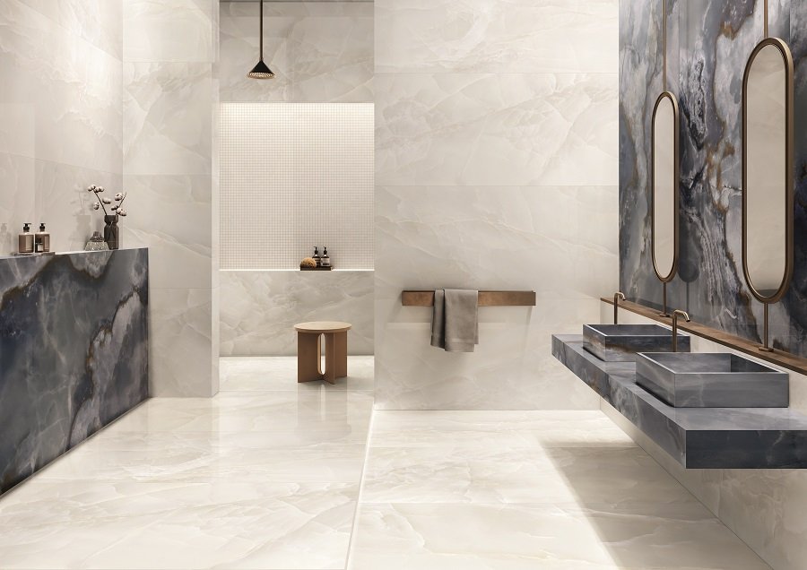 Từ bề mặt, màu sắc, đường vân của gạch tái hiện nét lộng lẫy của đá Onyx, phác họa chân thật vẻ đẹp tự nhiên, đến hiệu ứng màu sắc sống động tạo nên từ công nghệ phối màu và in 3D sắc nét của nhà sản xuất hàng đầu nước Ý, bộ sưu tập Tele di Marmo Onyx với những nét rất riêng đã trở thành sự tôn vinh vẻ đẹp quyến rũ của đá onyx: Những lớp trầm tích trong suốt, phản chiếu ánh sáng làm nên sự biến chuyển đầy tinh tế về sắc độ trong những đường vân tinh xảo, mãn nhãn cho mọi góc nhìn.