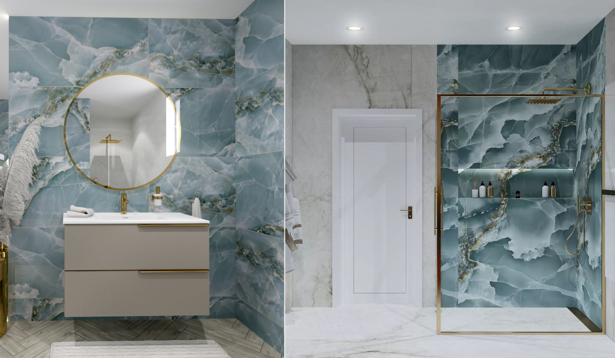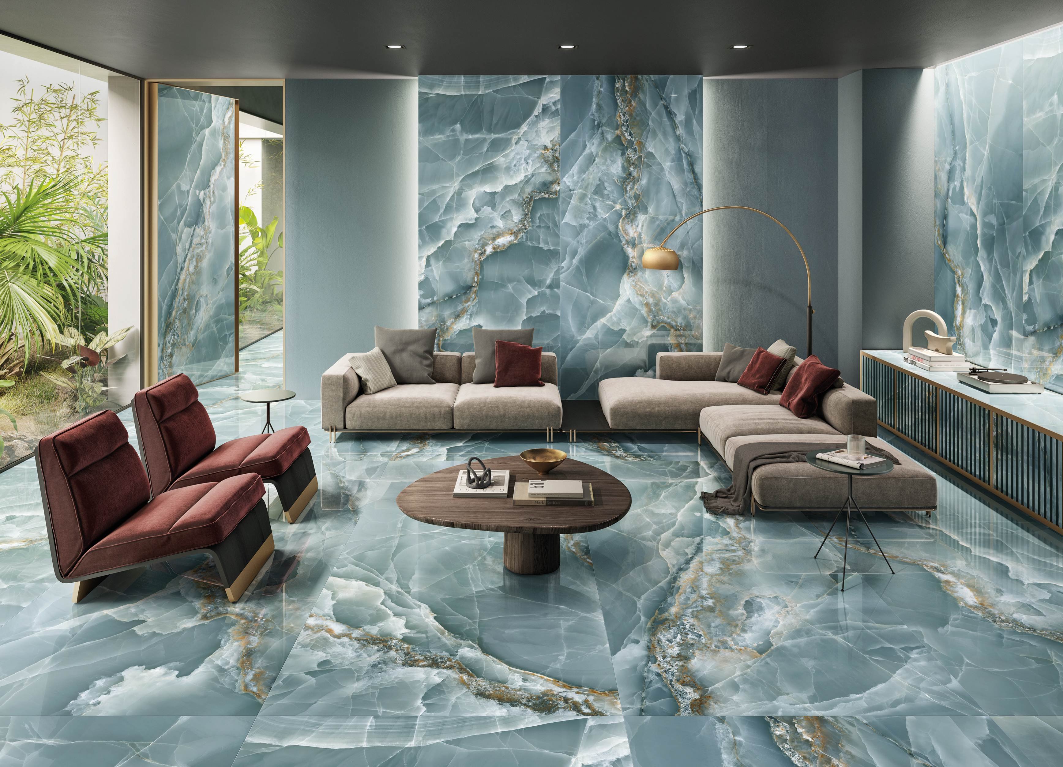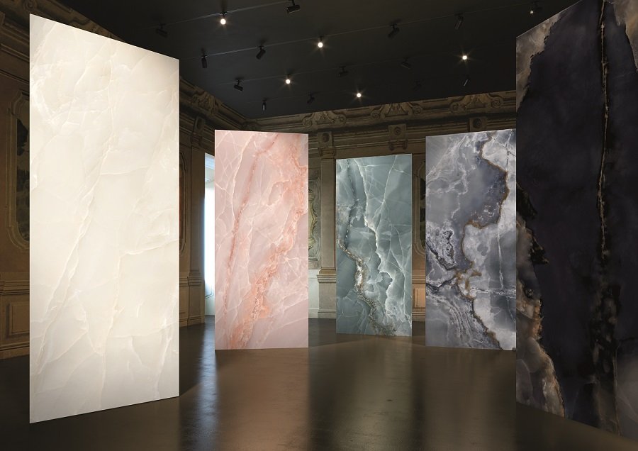 Bề mặt đá onyx của bộ sưu tập sở hữu vẻ đẹp trong trẻo, mang sắc thái mới lạ như màu lục lam, cùng hàng loạt các sắc độ và đường vân độc đáo trên cùng một viên gạch.
