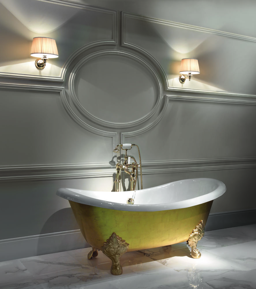 Làm sao để có cảm giác như hòa mình vào thiên nhiên, tái tạo năng lượng, chính là mục tiêu của xu hướng này. Theo đó, việc kết hợp giữa màu sắc của thiết bị phòng tắm với các chất liệu như gạch vân đá cẩm thạch, gạch họa tiết 3D sẽ đem đến một không gian thư thái trong nhà. Các thiết kế vòi nước hoặc vòi bồn tắm như Dandy hay Conventry được chế tác độc quyền bởi Devon & Devon với các gam màu vàng gold, vàng 18k hoàn hảo truyền cảm hứng, mang đến nguồn năng lượng hứng khởi cho phòng tắm cổ điển.
