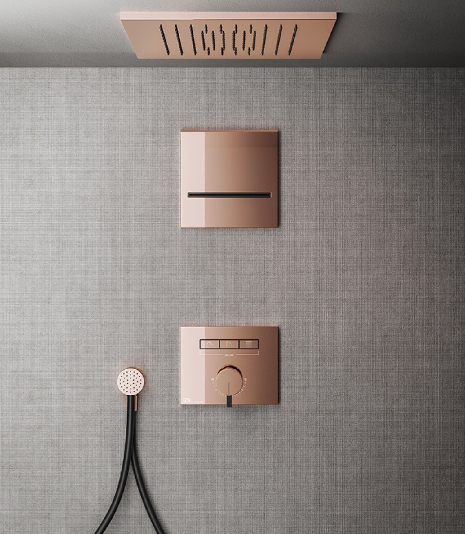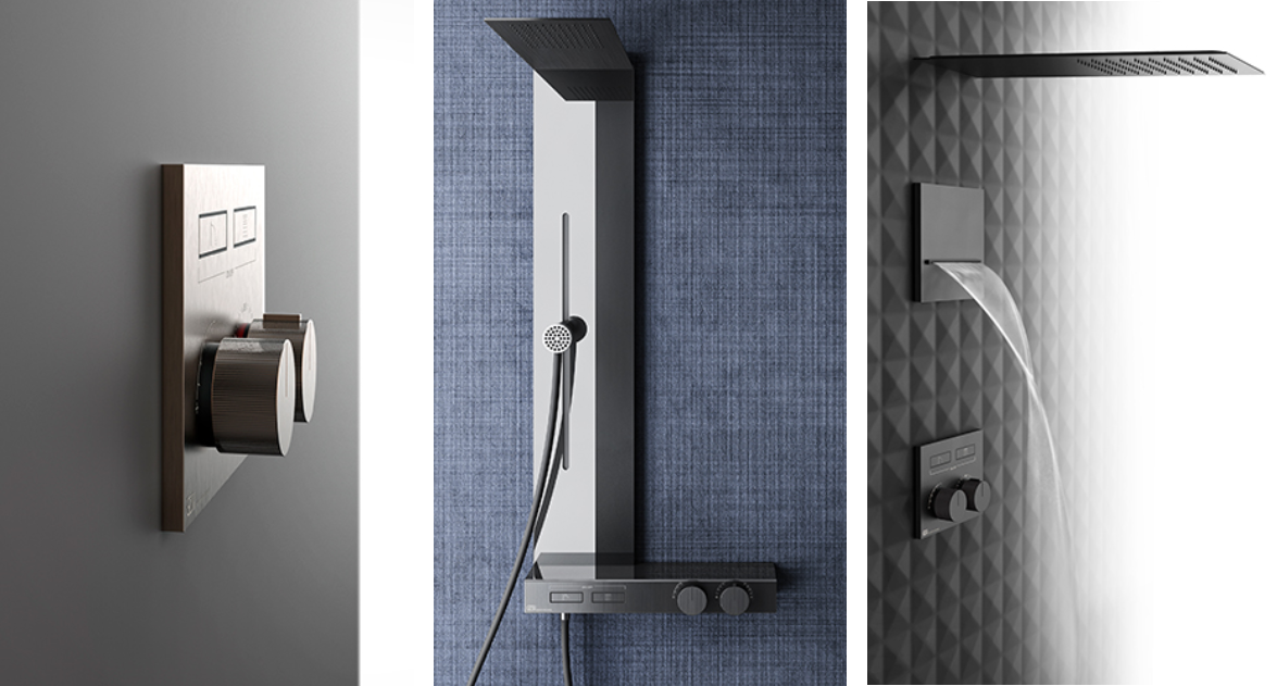 Mặt nạ điểu khiển các tính năng vòi hoa sen - “Linear thermostatic mixers Hi-Fi” với thiết kế từ 2 đến 5 chức năng chuyển đổi đường nước thoát ra từ vòi hoa sen và sen đầu cùng 2 tay cầm hình trụ để tùy chỉnh nhiệt độ và tốc độ của dòng nước, các chức năng được điều khiển bởi các nút trên bề mặt, mang đến thiết kế mặt nạ “Linear thermostatic mixers” thanh lịch, tối giản cho không gian phòng tắm hiện đại.