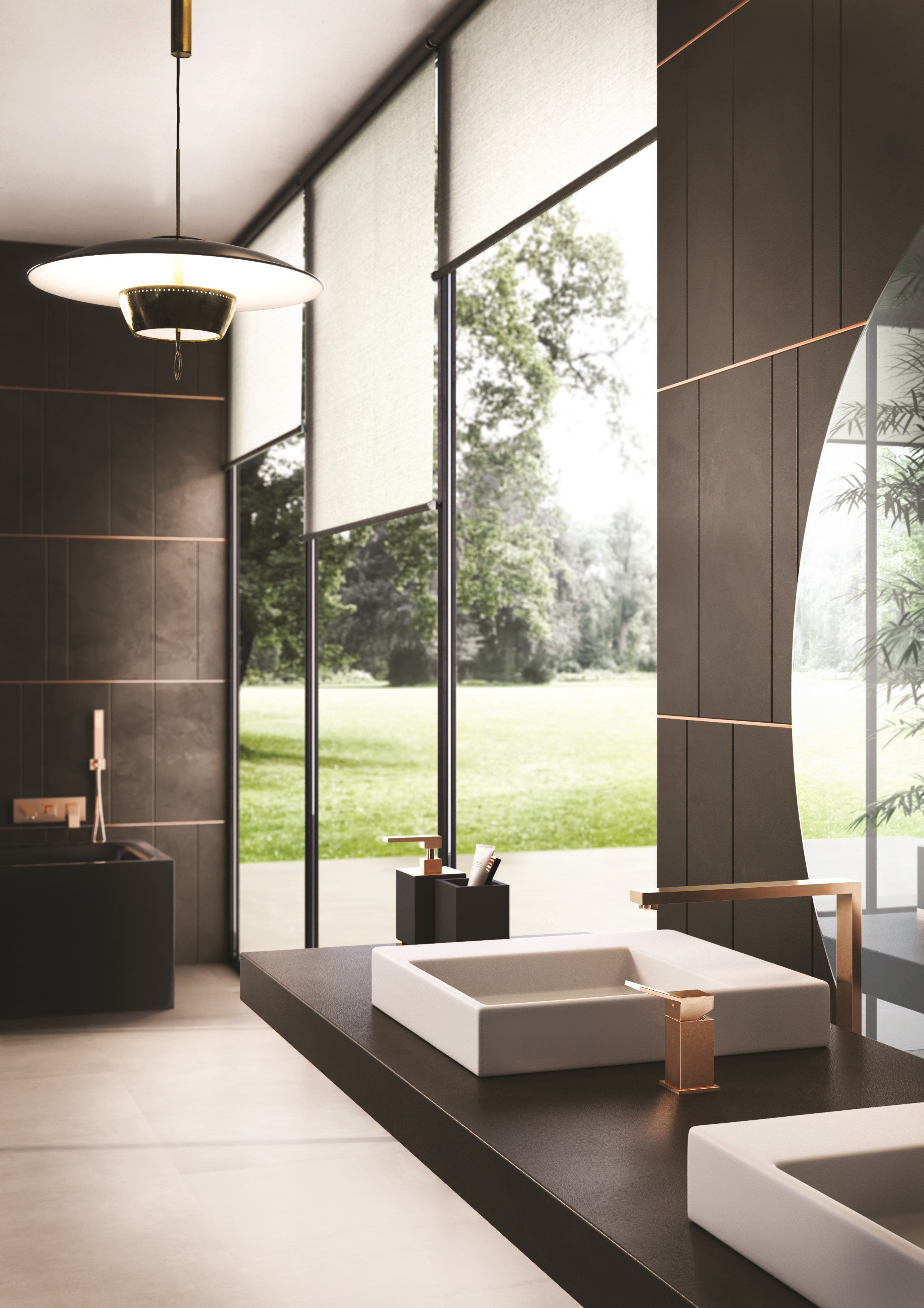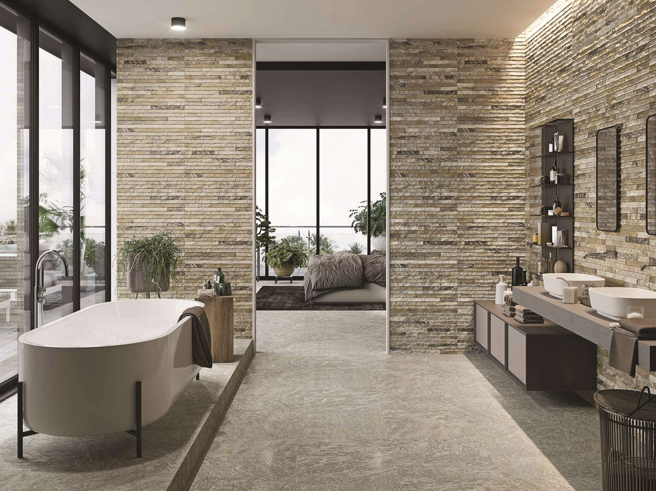 Sau cùng, xu hướng phòng tắm giờ đây được kết nối linh hoạt với phòng ngủ và các không gian khác trong nhà bằng lối trang trí tối giản, ứng dụng gạch ốp lát khổ lớn để kết nối không gian cho cả sàn và tường. Bên cạnh đó, thiết kế còn kết hợp với những đường nét mềm mại của thiết bị vệ sinh, như chậu rửa hay bồn tắm đặt sàn, mang đến không gian kết nối, mà vẫn đảm bảo tính thẩm mỹ, cũng như định hình phong cách riêng cho mỗi gia chủ.