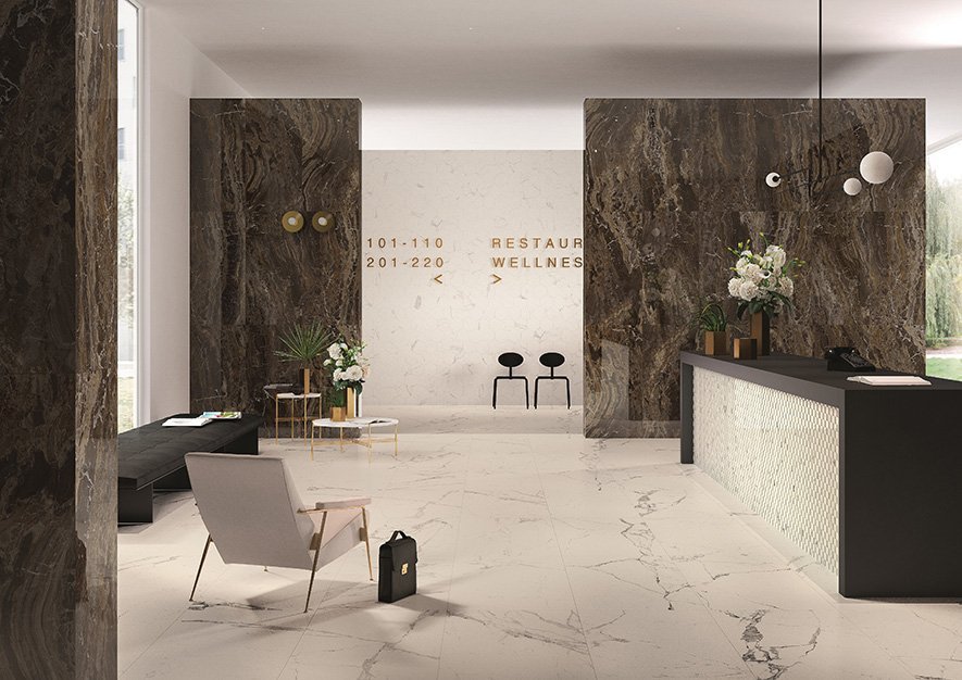 Các thiết kế mới lạ, ấn tượng của gạch khổ lớn, gạch vân đá cẩm thạch marble hay gạch vân gỗ với màu sắc, kích thước đa dạng dễ dàng trở thành tâm điểm của bất cứ không gian nội thất nào. Điểm nhấn của các thiết kế gạch ốp lát vân đá marble từ vân đá calacatta đến vân đá onice nằm trong các thiết kế ‘trendy’ có thể kể đến các bộ sưu tập như All Marble, Tele Di Marmo Revolution hay Akoya hứa hẹn sẽ đem đến một bản giao hưởng đầy sắc màu tinh tế.