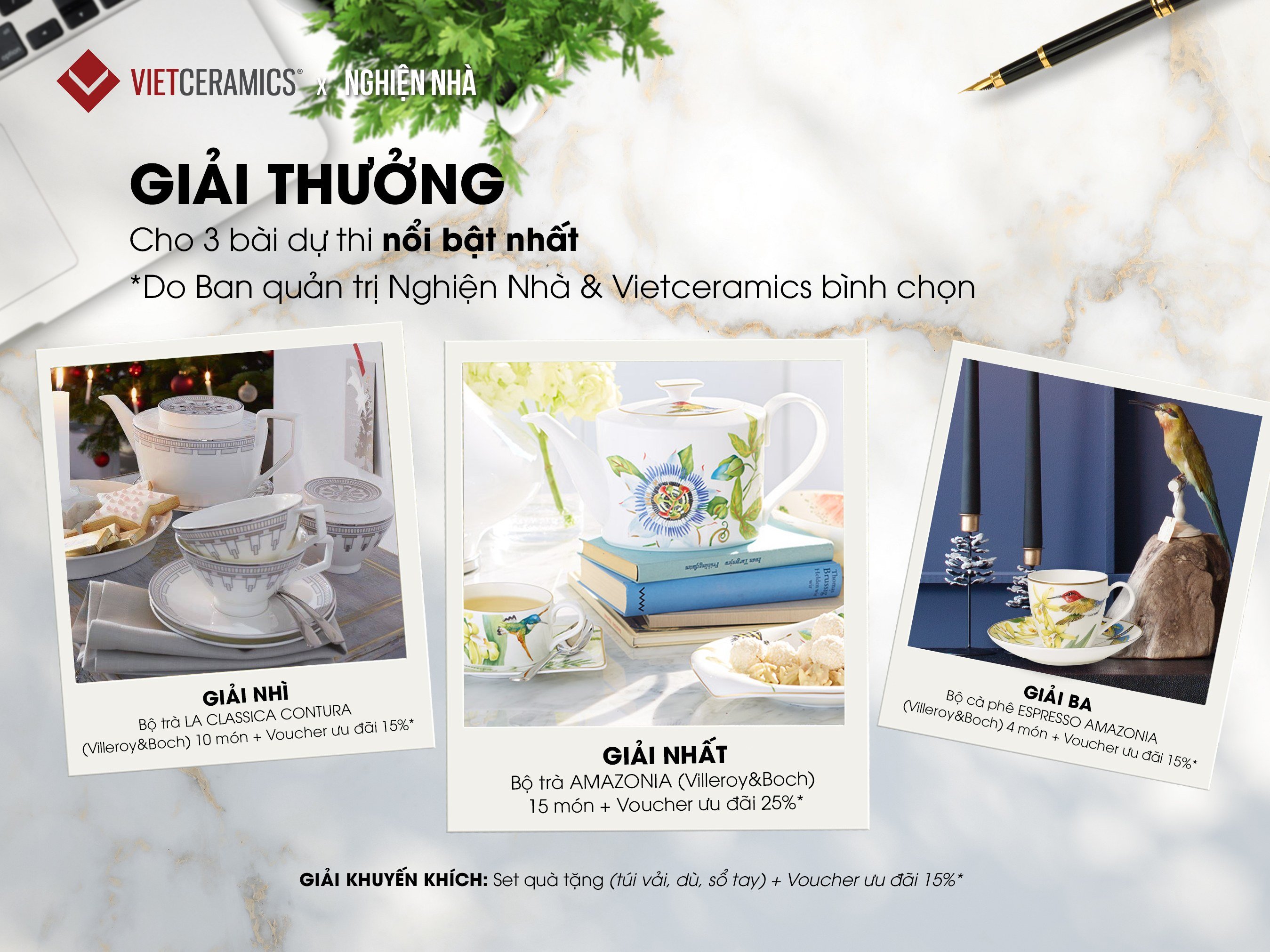 Được tổ chức cùng Nhóm Nghiện Nhà, các chủ nhà được mời tham gia chia sẻ về những câu chuyện Nhà sẽ được bình chọn dựa trên tiêu chí cũng như đáp ứng được tinh thần của cuộc thi từ Ban Quản trị Nghiện Nhà và Vietceramics. Với các phần giải thưởng giá trị là các bộ sưu tập bàn ăn đẳng cấp cũng như voucher giá trị, bạn có thể có thêm những ý tưởng mới để trang hoàng không gian sống ấn tượng với các sản phẩm gạch ốp lát, thiết bị phòng tắm hay bộ bàn ăn từ Vietceramics. Nếu bạn yêu thích phong cách cổ điển, các đường nét trang trí tinh tế và thời trang của bộ sưu tập bàn ăn La Classica Contura, được chế tác từ chất liệu sứ xương cao cấp chắc chắn sẽ đem đến một không gian sống trang nhã và tinh tế. Còn bạn đang tìm kiếm không gian sống tràn ngập nét đẹp của tự nhiên, thiết kế và màu sắc ấn tượng của vùng nhiệt đới từ bộ bàn ăn Amazonia là một lựa chọn hoàn hảo cho không gian tươi mới.