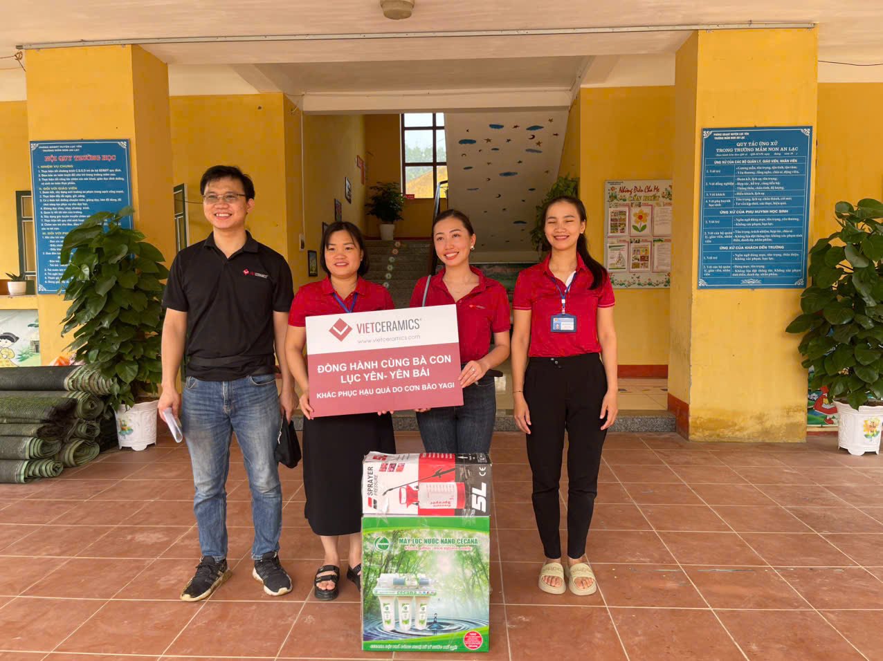 Vietceramics đã hỗ trợ tiền mặt, gạo, gia vị và ấm đun siêu tốc cho 21 hộ có hoàn cảnh khó khăn, cùng 35 phần quà gồm cặp, vở, dụng cụ học tập và bánh kẹo dành cho các gia đình có trẻ em. Bên cạnh đó, đoàn cũng ủng hộ máy lọc nước và tiền mặt cho trường mầm non của xã.