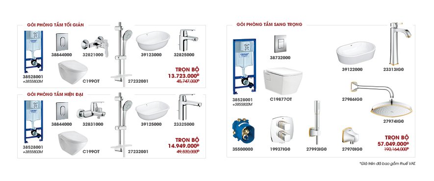 Các sản phẩm ưu đãi bao gồm lavabo, vòi lavabo, vòi bồn tắm, bộ sen tắm và các phụ kiện phòng tắm.